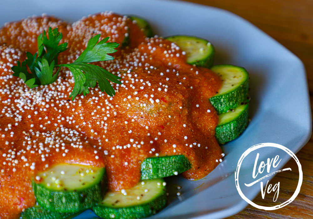 En un sartén amplio, calienta 2 cdas. de aceite de oliva y fríe las calabacitas, agrega el consomé vegetal y pimienta al gusto, deben quedar crocantes, en cuanto cambien de color retira del fuego. Sirve en un plato las calabacitas y baña de mole de amaranto, espolvorea amaranto para decorar.
