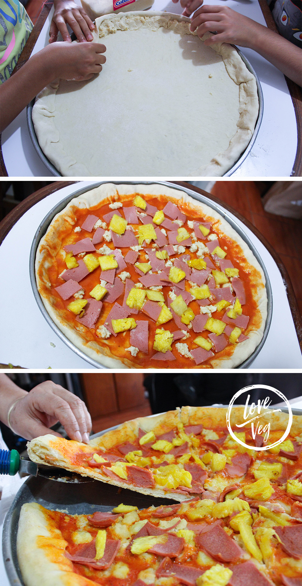 Esta pizza hawaiana con orilla rellena de queso es de esas recetas que hacen feliz a toda la familia, especialmente a las y los más peques, que no solo la disfrutan, sino que también pueden participar en su preparación, lo mejor: está hecha 100 % libre de crueldad.