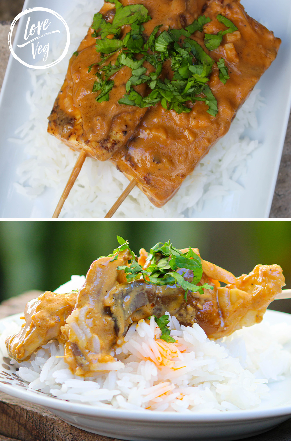 Tus brochetas pueden ser de tofu o de setas y puedes usar el arroz que tengas en casa