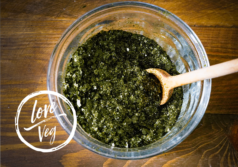 Tritura las algas nori en la licuadora hasta obtener un polvo fino, mezcla la sal, el alga y el ajo en polvo y vacía en un recipiente de vidrio hermético.