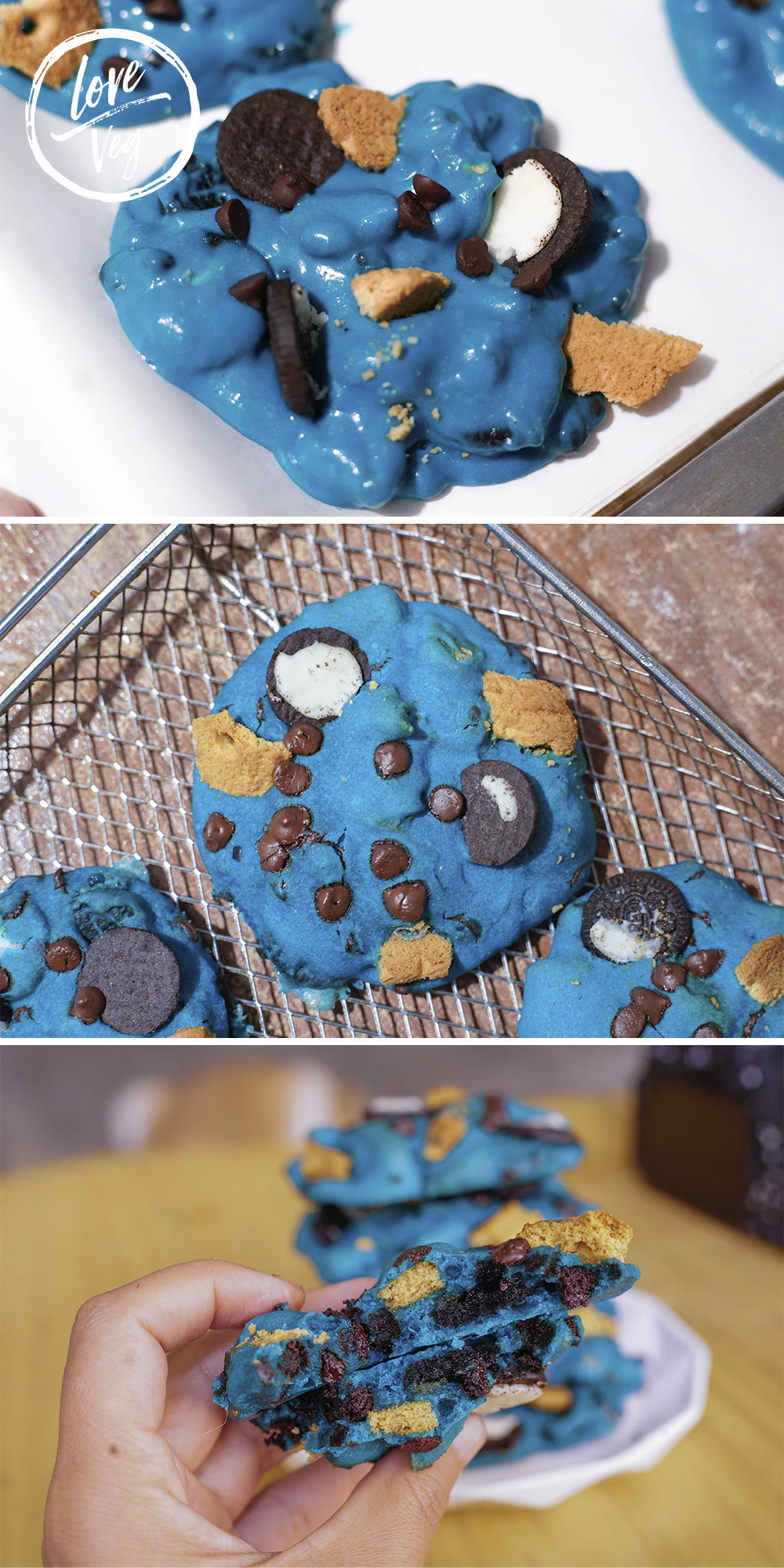Prepara una bandeja para horno con papel encerado o engrásala ligeramente con aceite de coco. Coloca porciones de masa formando de ocho a diez galletas, y decora la superficie con los trozos de galleta reservados y más chispas de chocolate. Hornea a 180 °C durante 30 a 40 minutos, o hasta que estén ligeramente doradas en los bordes.